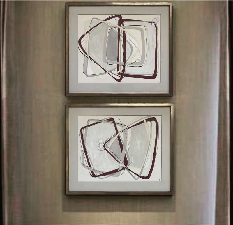 PAIR ‘Claret Eternity’ Gouache on Board under Glass in Water Gilt Gold Leaf frames with Antique Finish