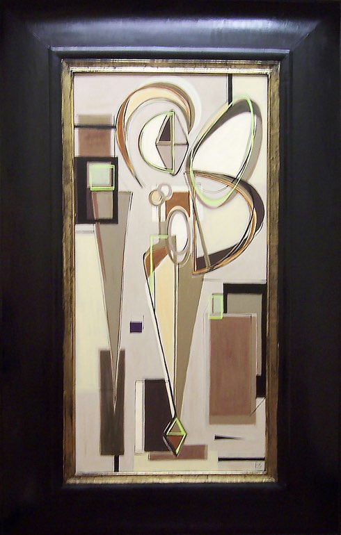 'Standing Showgirl in Green & Brown' Oil & Acryllic on Board in Modern Frame