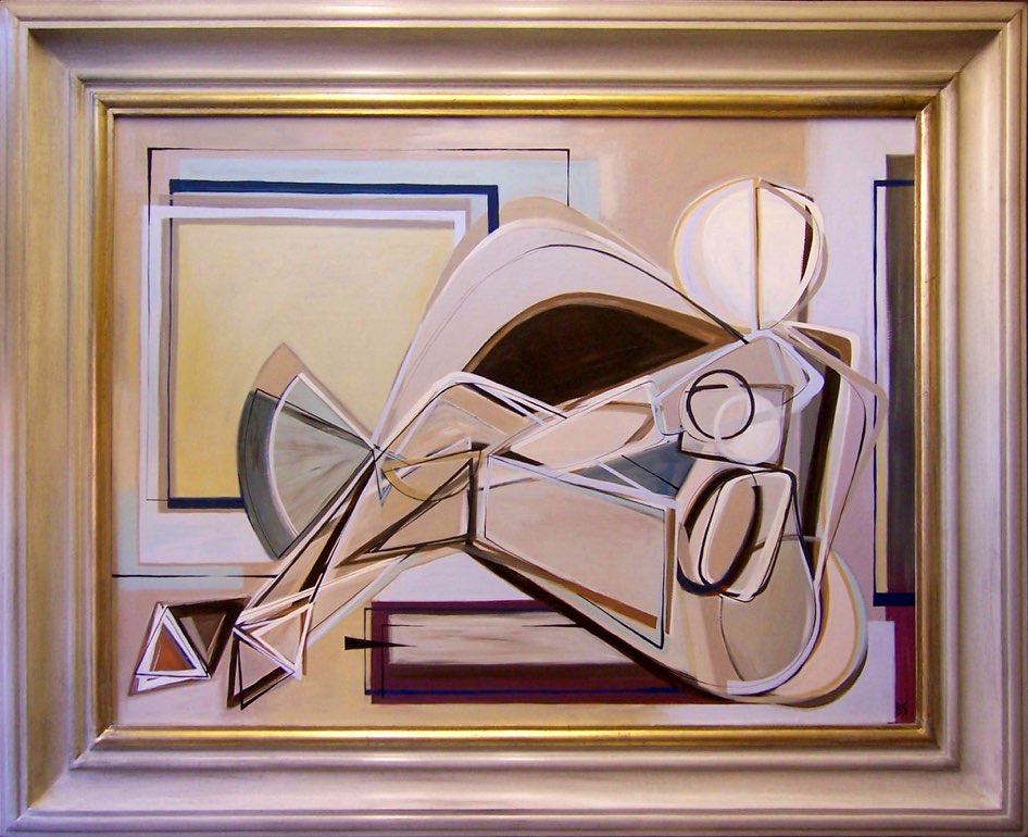 'Blue Nude with Fan' Oil and Acrylic on Board in Cream and Gold Frame