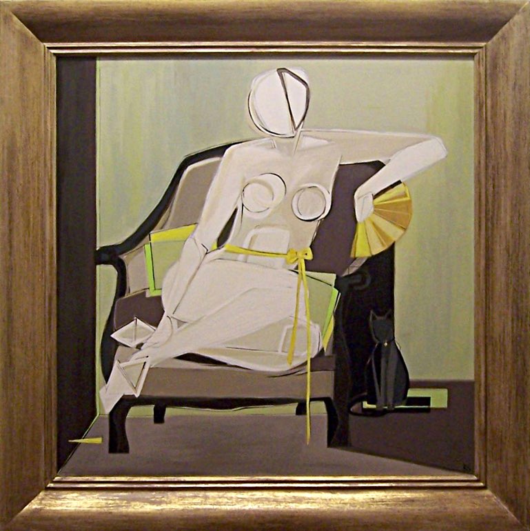'Brunette, Yellow Fan and Rupert' Oil & Acryllic on Board in Modern Gold Frame
