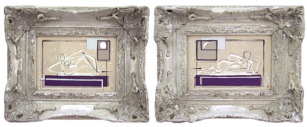 PAIR 'Nude in Midnight Snowglobe' Left & Right Study, Gouache & Silver Leaf on Board in Silver Gilt Frames