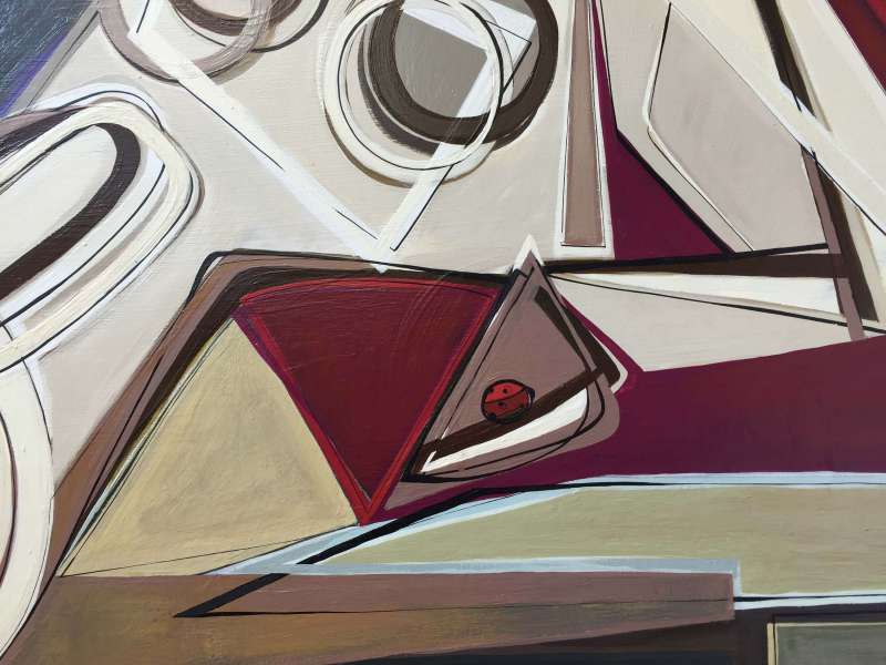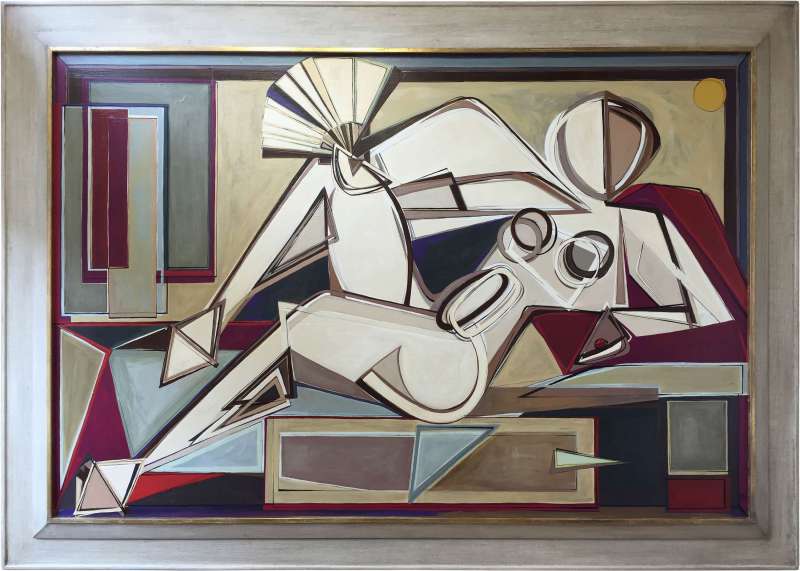 'Reclining Nude under Sun with Fan & Ladybird' Oil & Acrylic on Board in 1960s Cream & Gold Frame