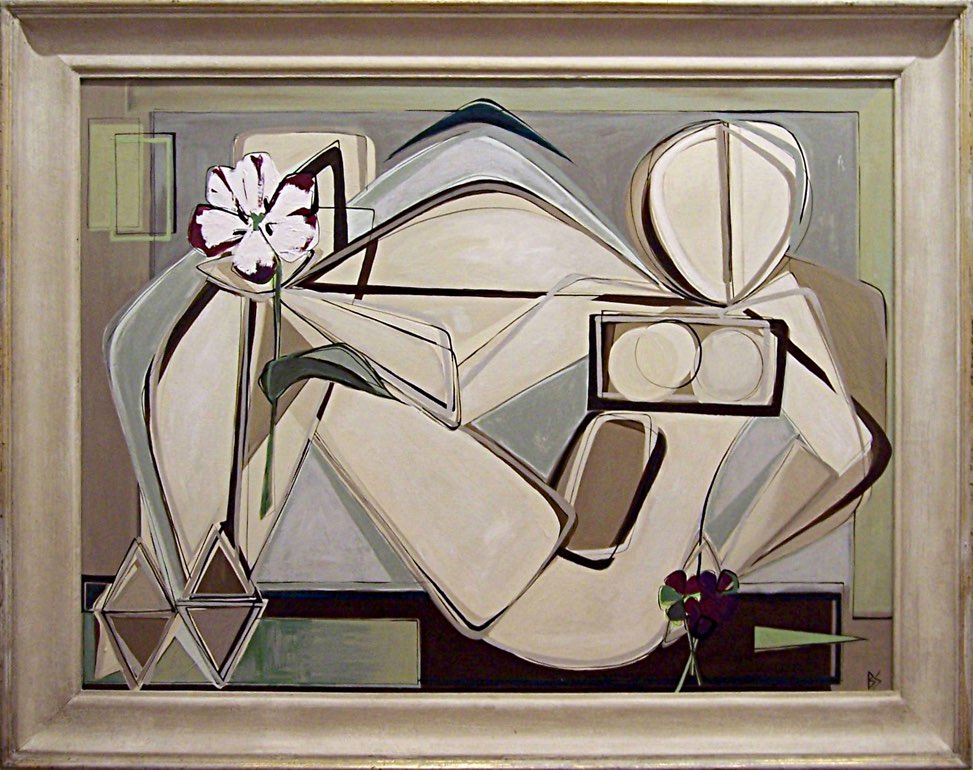 'Reclining Nude with Spring Flowers' Oil & Acrylic on Board in Antique Cream & Gold Wooden Frame