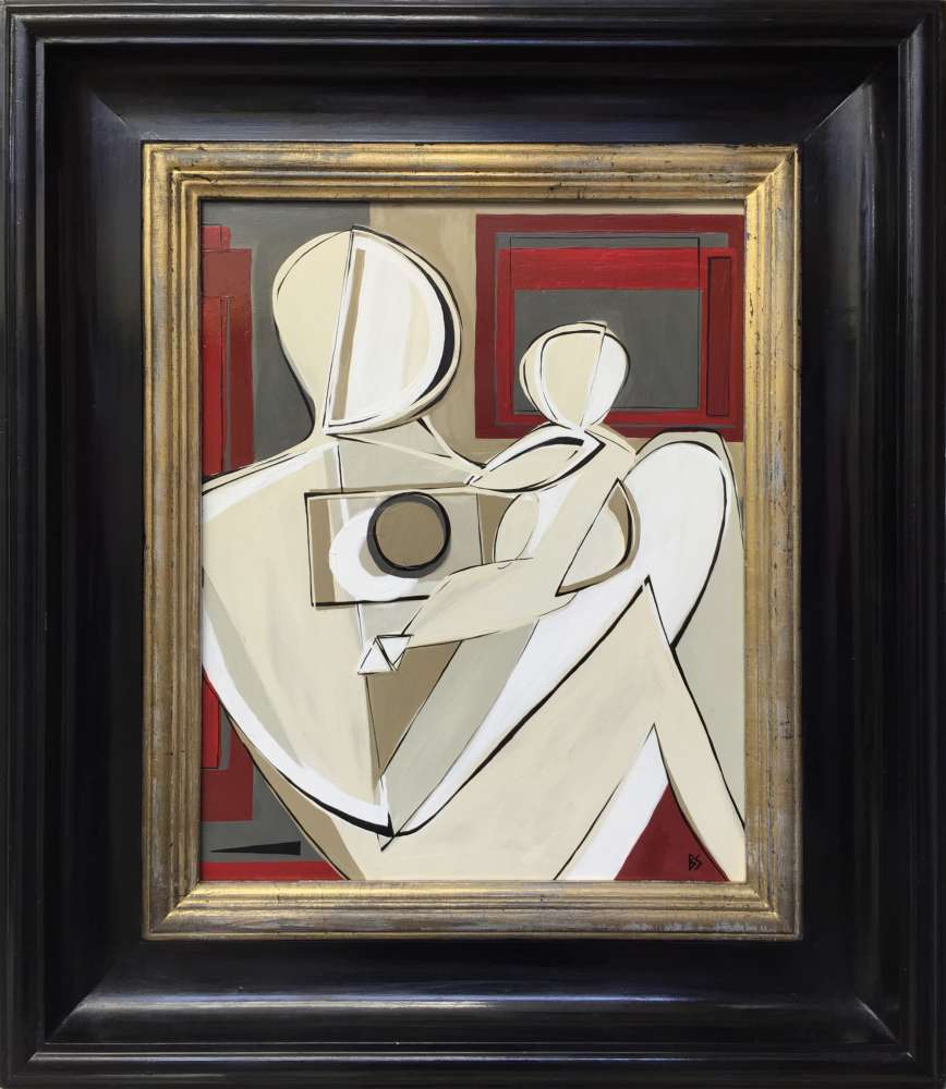 'Mother & Child' Oil & Acrylic on Board in Gold & Black Lacquer Wooden Frame
