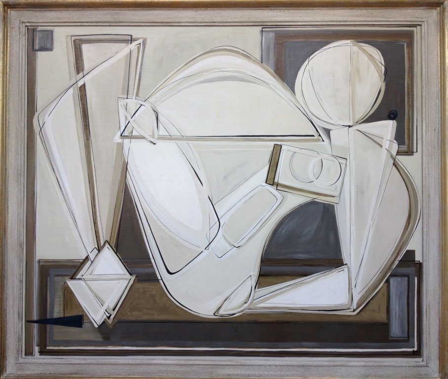 'Reclining Stone' Oil & Acrylic on Board in Cream & Gold Leaf Wooden Frame