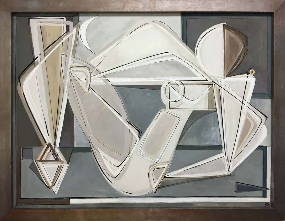 'Night Owl Muse' Oil & Acrylic on Board in 1970s Silver/Bronze Finish Tray Frame with Sloping Edges
