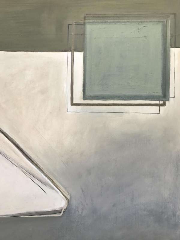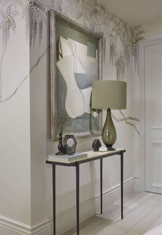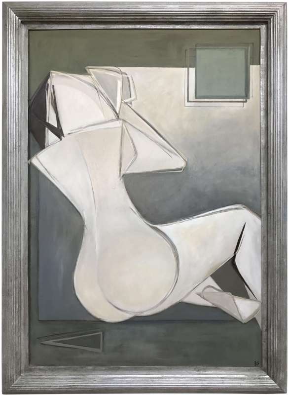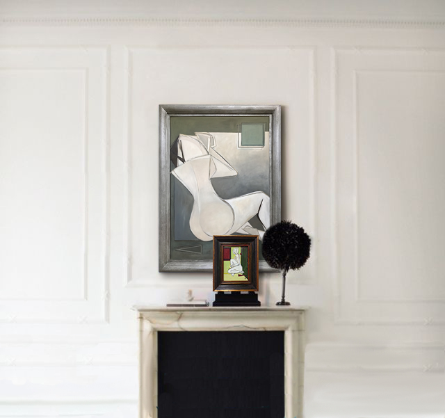 'Silver Peach Brunette on Moss' Oil & Acrylic on Board in Deco Style Fluted Silver Leaf Frame