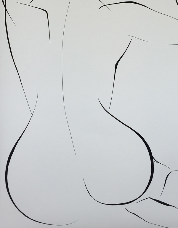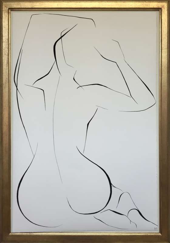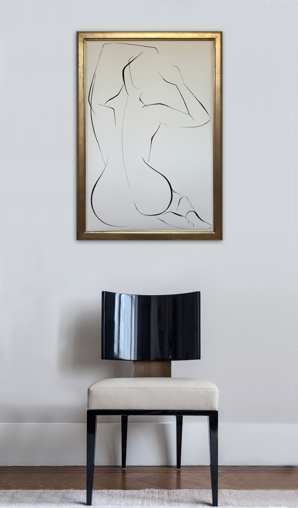 Large Linear Nude Pose No.30 Gouache on Handmade Paper in Gold Gilt Frame