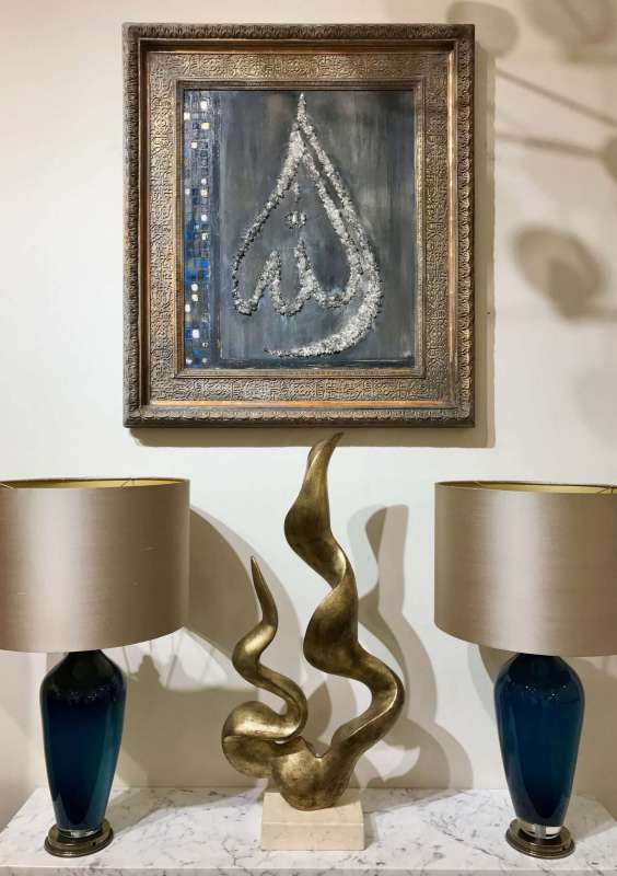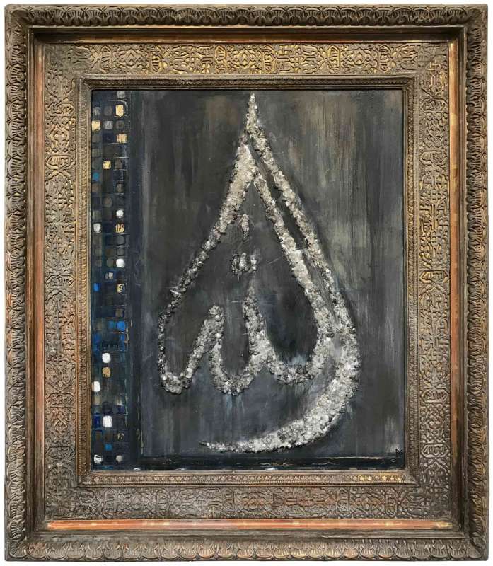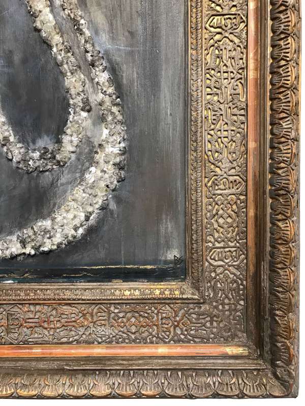 'Script' Oil, Acrylic, Gold Leaf & Glass on Board in Carved Antique Gold Leaf Frame
